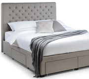 Crafted from beautiful grey linen fabric, the Wilton Bed exudes sophistication and grace. With a deep buttoned headboard and 4 drawers, not only is this bed gorgeous to look at – it provides additional space for all your storage needs. This bed adds a touch of elegance and sophistication to any bedroom. The drawers are seamlessly integrated into the bed frame, offering a sleek and functional design without compromising on style.