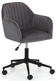 Finished in soft grey velvet, the Kahlo swivel office chair features a filled seat with a curved backrest, giving a beautiful look as well as maximum comfort. The height adjustable gas lift mechanism and wheeled swivel base provides practicality, whilst the pleated back adds to the traditional art deco design.