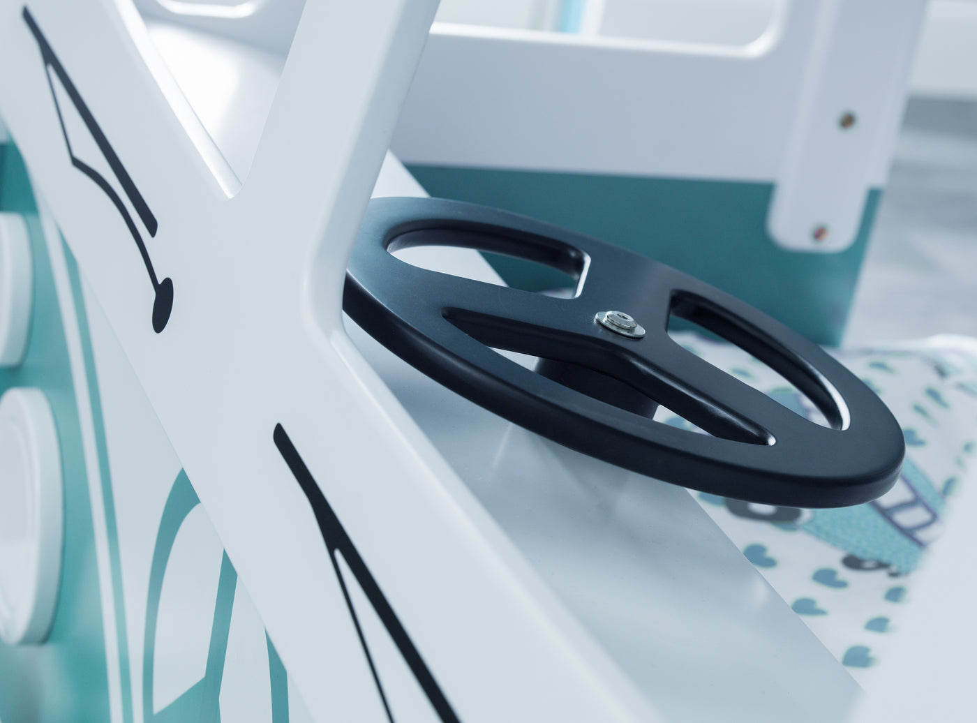The Campervan Bunk Bed is the perfect fun design for your child's bedroom! This beautifully crafted, sturdy bed will make your child feel secure at bedtimes, as well as providing a fun space for them to use during the day. Featuring a surfboard style ladder, steering wheel and very accurate detailing to give a realistic look. Vintage green and white.